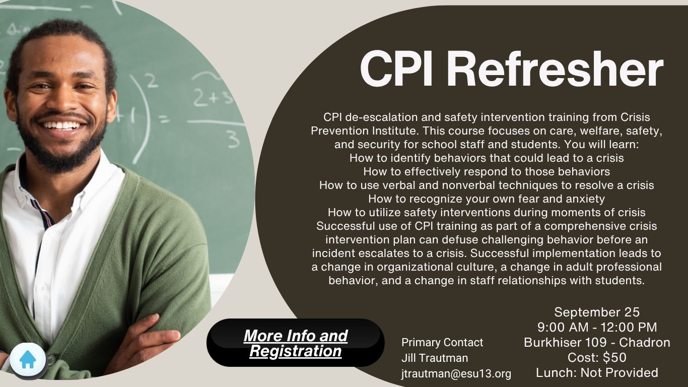 CPI de-escalation and safety intervention training from Crisis Prevention Institute. This course focuses on care, welfare, safety, and security for school staff and students. You will learn: