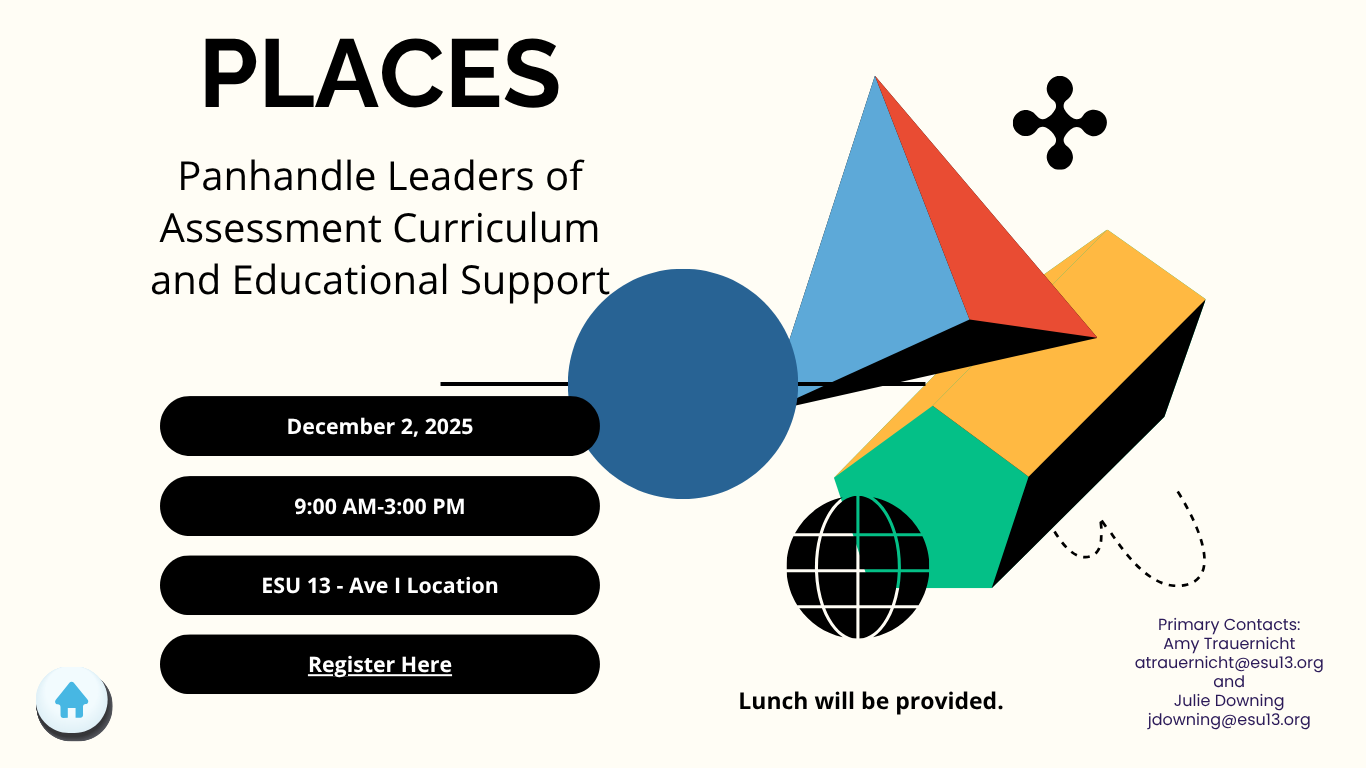 | | 0 | SOAR Advisory: PLACES Curriculum/Assessment | 12/2/2025 9:00:00 AM | | ESU 13 | | System.Collections.Generic.List`1[odie.workshops.Facilitator] | | 0.00 |  | odie.workshops.Section |