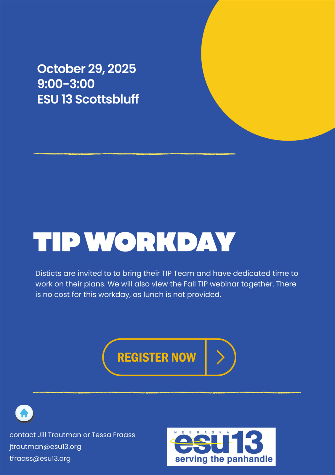 Disticts are invited to to bring their TIP Team and have dedicated time to work on their plans. We will also view the Fall TIP webinar together.