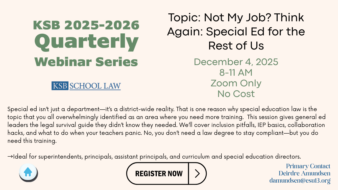 Special ed isn't just a department-it's a district-wide reality. That is one reason why special education law is the topic that you all overwhelmingly identified as an area where you need more training. This session gives general ed leaders the legal survival guide they didn't know they needed. We'll cover inclusion pitfalls, IEP basics, collaboration hacks, and what to do when your teachers panic. No, you don't need a law degree to stay compliant-but you do need this training.