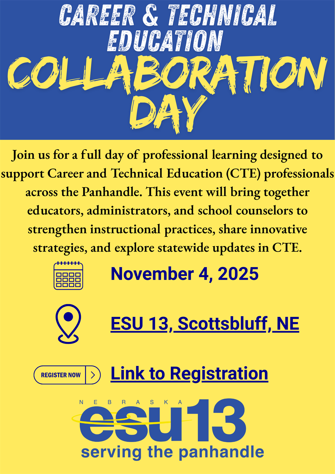 Join us for a full day of professional learning designed to support Career and Technical Education (CTE) professionals across Nebraska. This event will bring together educators, administrators, and school counselors to strengthen instructional practices, share innovative strategies, and explore statewide updates in CTE.