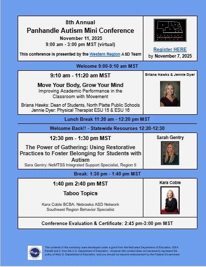 Panhandle Autism Mini Conference - Intended audience includes special education teachers, Paraprofessionals, SLP, OT, PT, School Psychologists, Parents, Administrators, Advocates